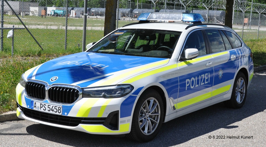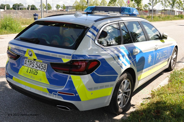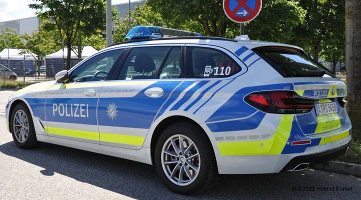 BMW 5er im Mineralweiß metallic/blau/gelbe Markierungen