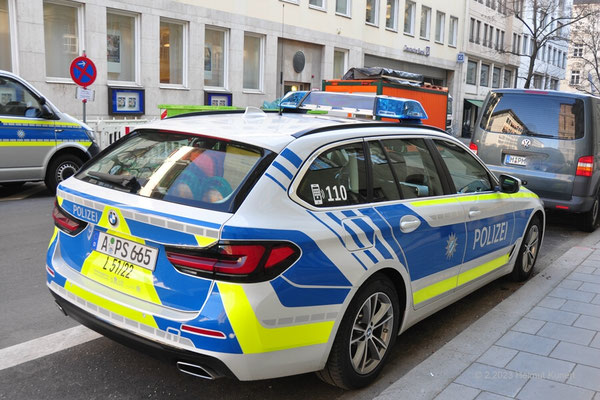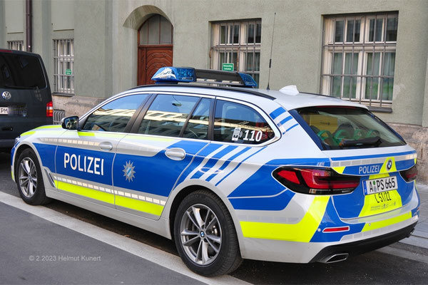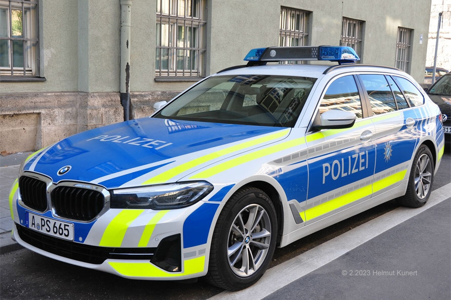 BMW 5er im Mineralweiß metallic/blau/gelbe Markierungen