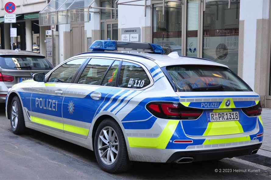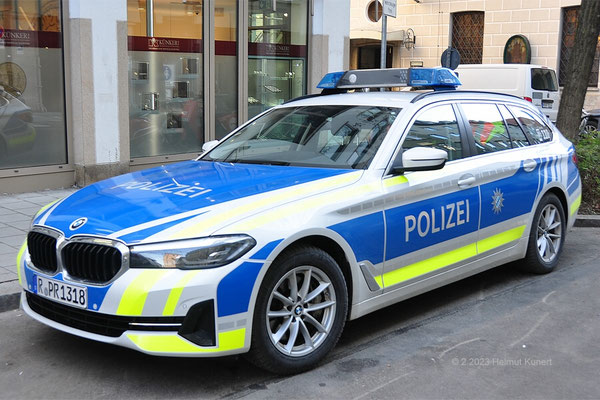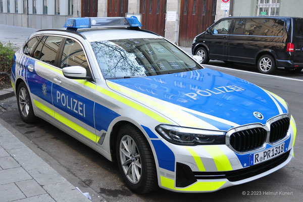 BMW 5er im Mineralweiß metallic/blau/gelbe Markierungen