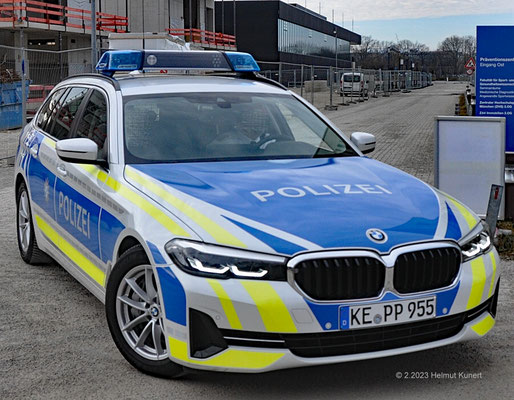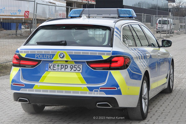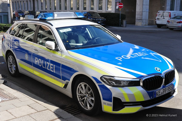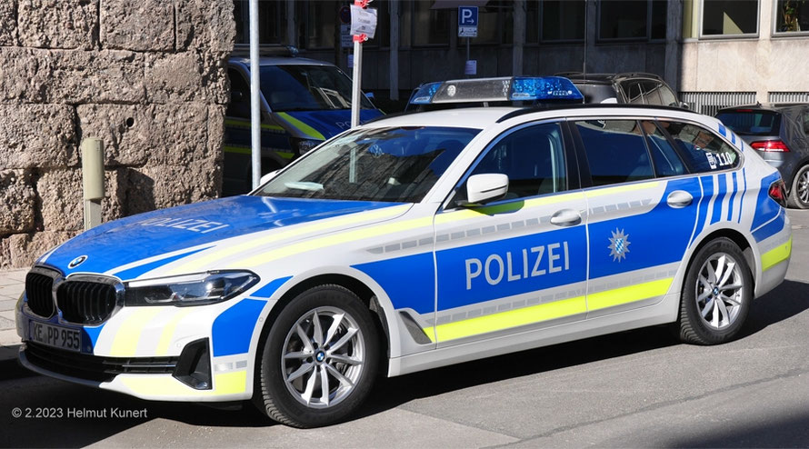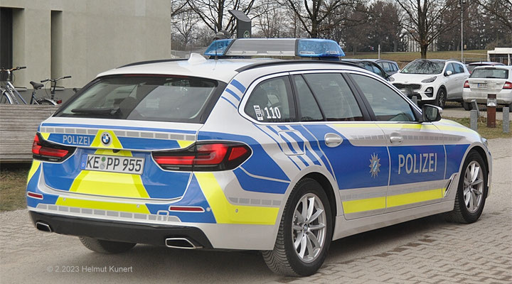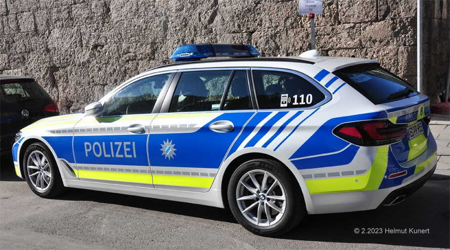 BMW 5er im Mineralweiß metallic/blau/gelbe Markierungen