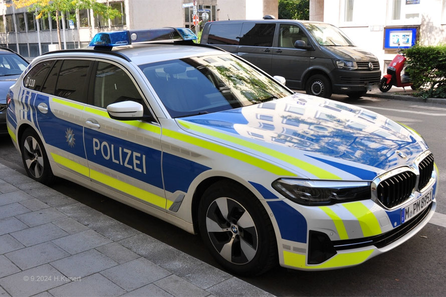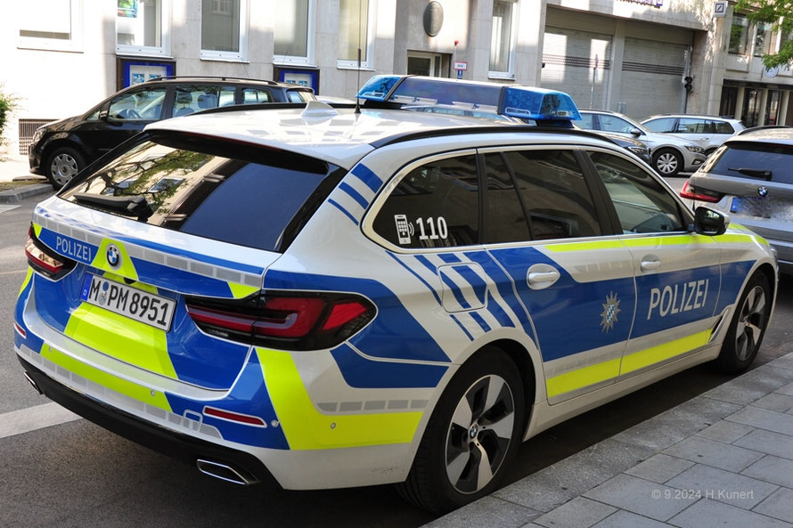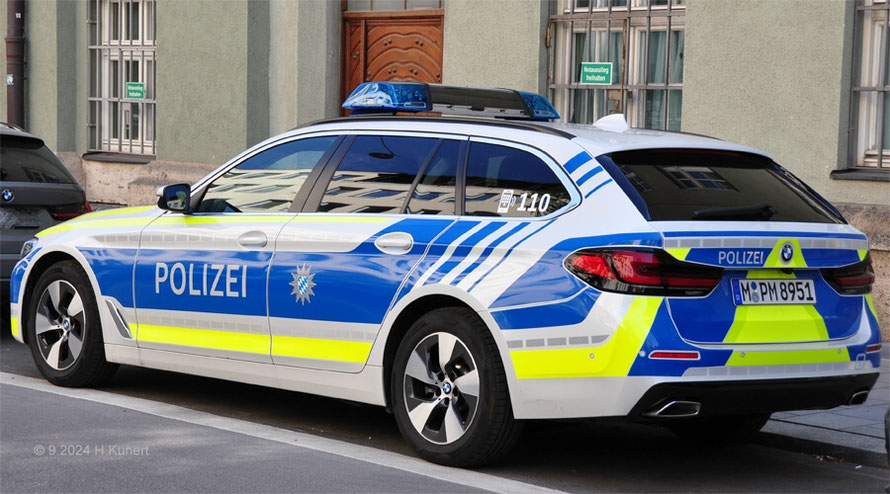BMW 5er im Mineralweiß metallic/blau/gelbe Markierungen