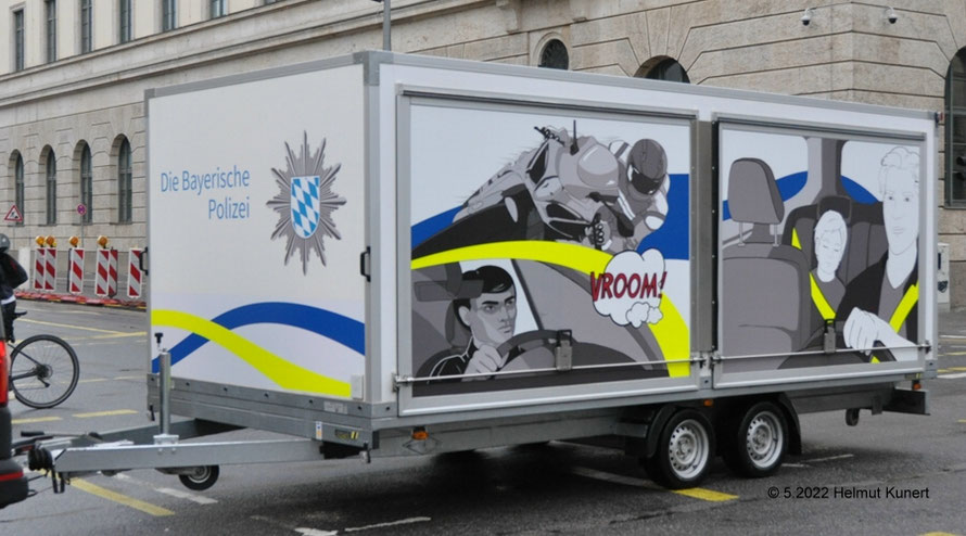 Der Anhänger wurde im Rahmen der bayernweiten Aktion „Bayern Mobil, Sicher ans Ziel Verkehrssicherheit 2030“ beschafft. Er wird bayernweit bei Veranstaltungen der Polizei, die sich mit der Verkehrssicherheit befassen gezeigt.