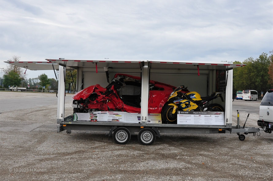 Infoanhänger des PP Niederbayern, der die Totalschäden, mit tödlichem Ausgang, eines illegalen Rennens zeigt.