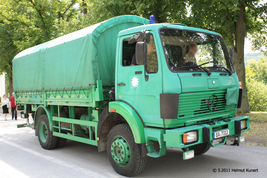 1 Steckblaulicht vorn mittig, hinten Steckblaulicht durch die Plane, grüner Unterfahrschutz, Ladebordwand