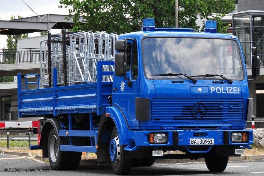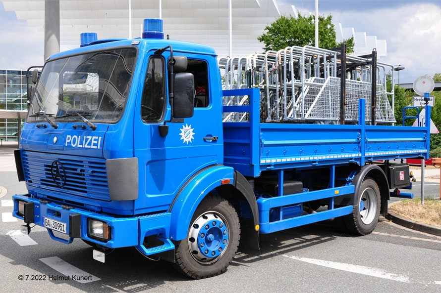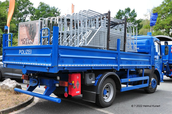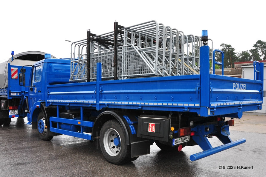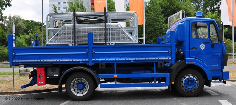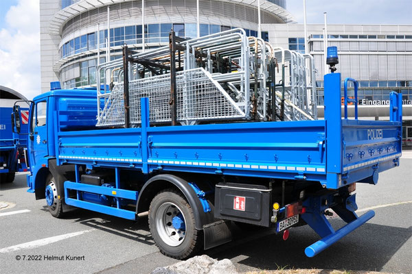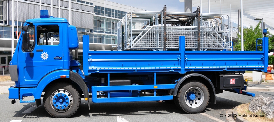 Mit der Umlackierung erfolgte die Anbringung von 2 Blaulichtern auf der Kabine und eines Steckblaulichtes an der Heckseite. Originalzustand des LKW siehe: Hier