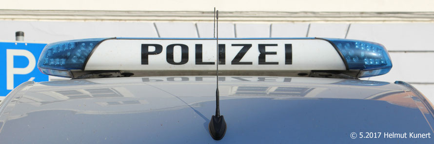 Hinten: 2 Blaulichter und Anhaltesignalgeber hinter linker Scheibe.