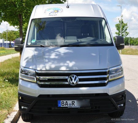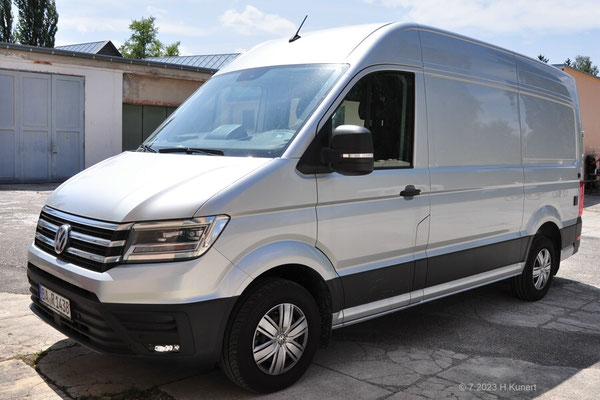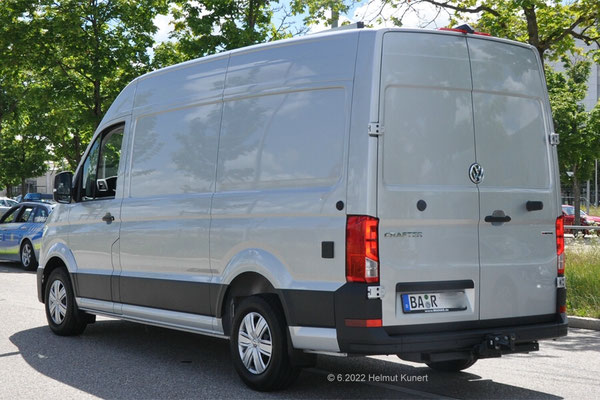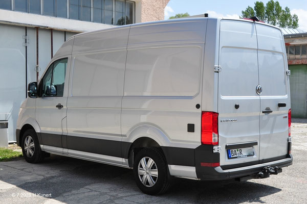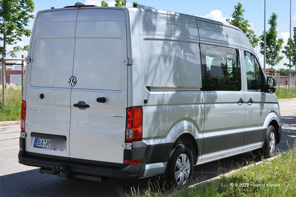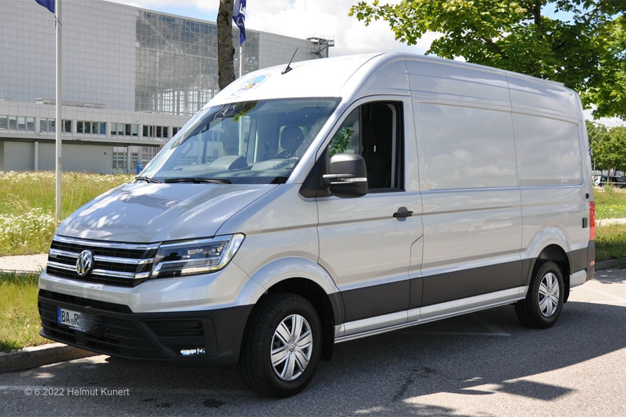 Dieser in neutraler Farbe gehaltene Crafter 4Motion hat nur einen Aufkleber mit dem Wappen der
