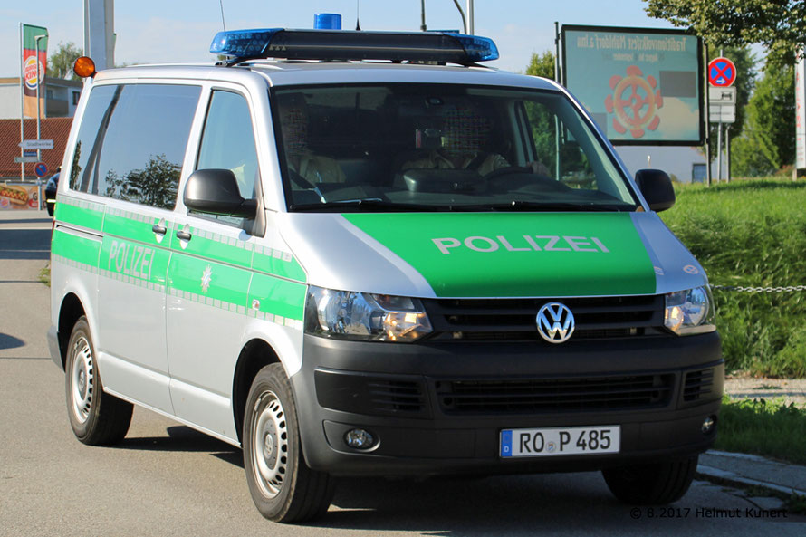 Streifenwagen oder Gefangentransporter mit Dachlüfter und dem Hinweis "Notausstieg" auf Heckklappe